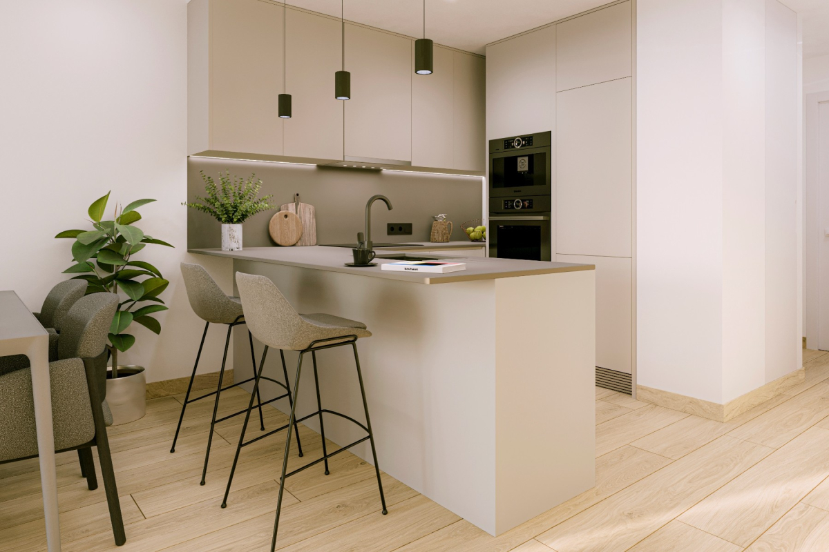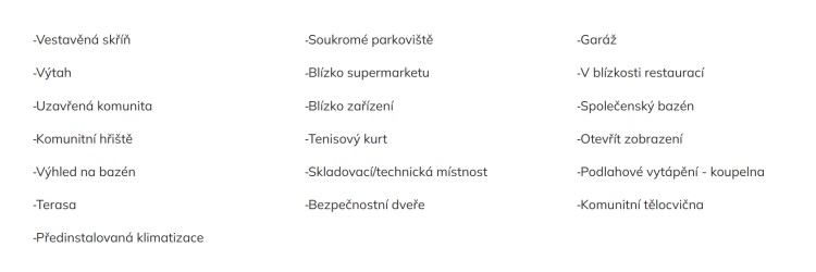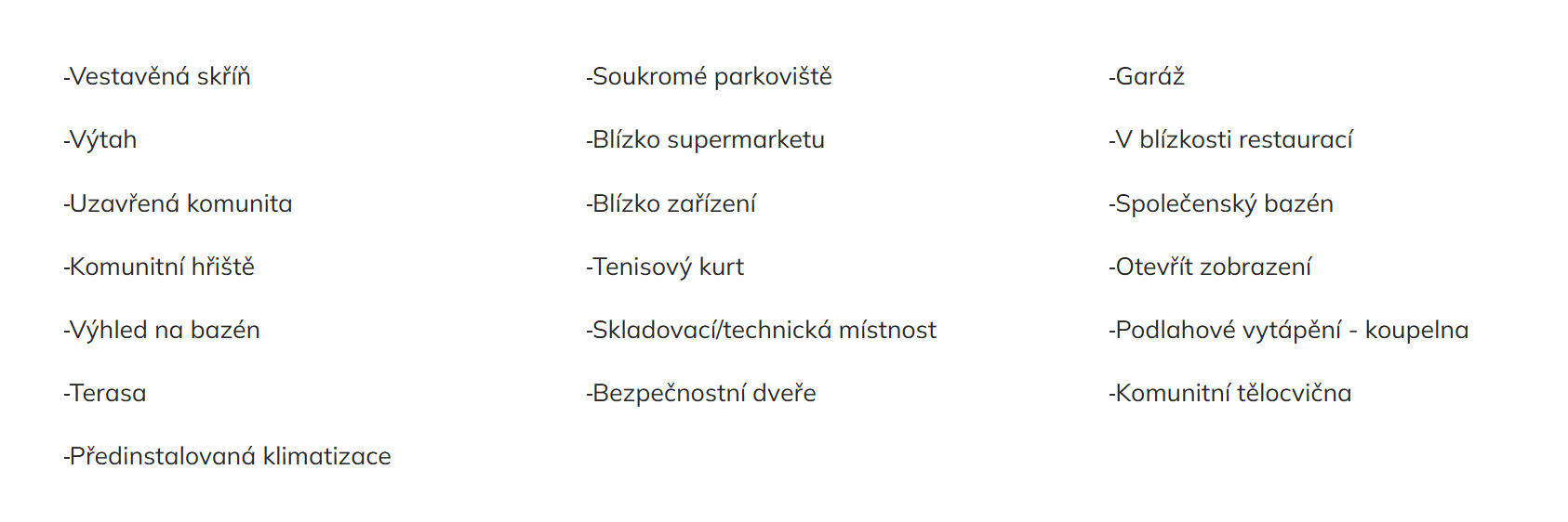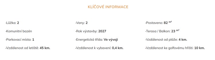 Na výběr jsou apartmány se 2 a 3 ložnicemi, vždy se 2 koupelnami a ideální orientací na jih a západ. Velkým benefitem je kompletní vybavení a nábytek v ceně – kupujete hotové bydlení bez dalších investic.